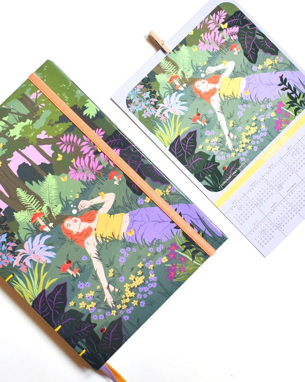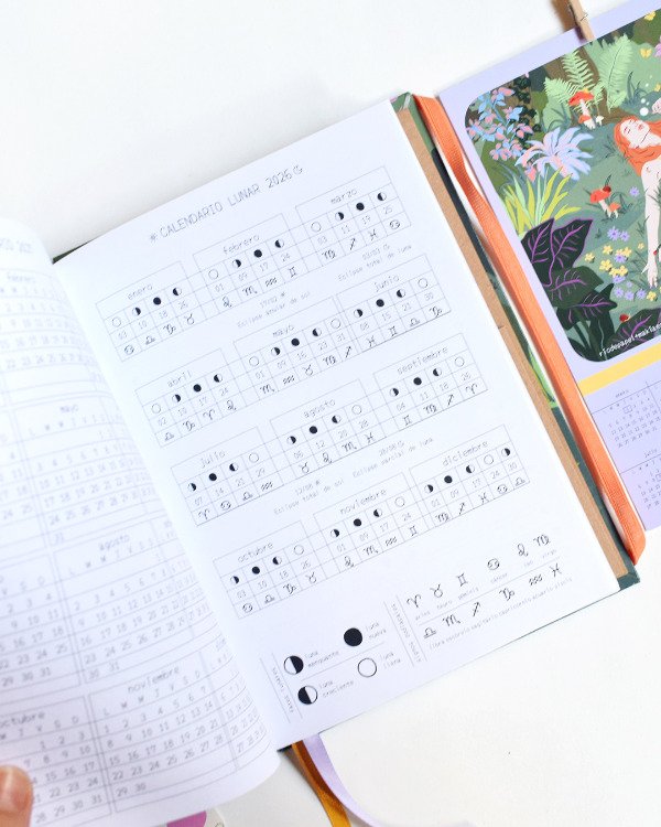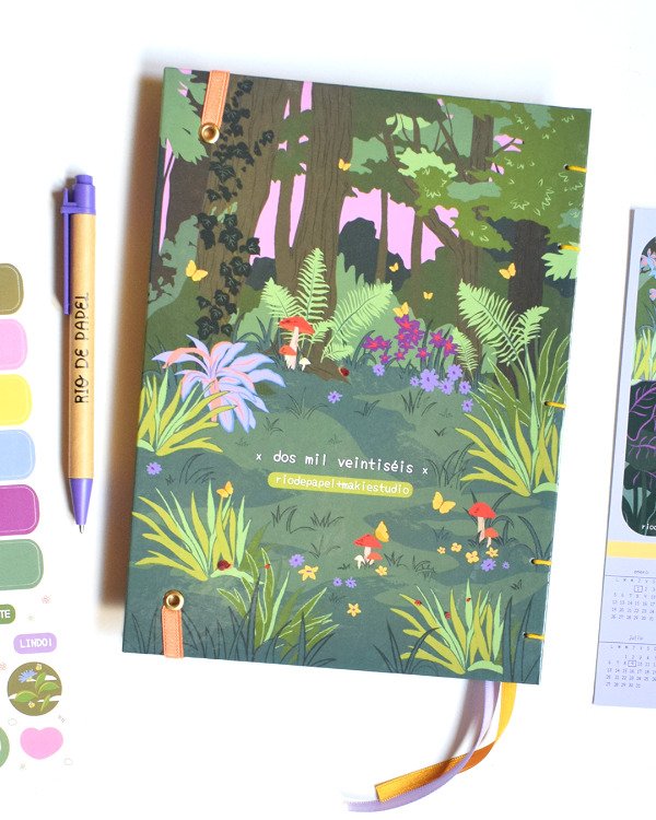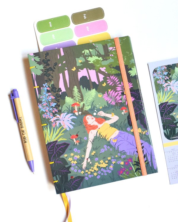 CAJA BONITA + AGENDA 2026 + PLANCHA ADHESIVA DE SOLAPAS + CALENDARIO 2026 ILUSTRADO A5+ LAPICERA RIODEPAPEL DIVINA