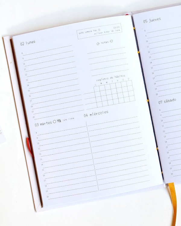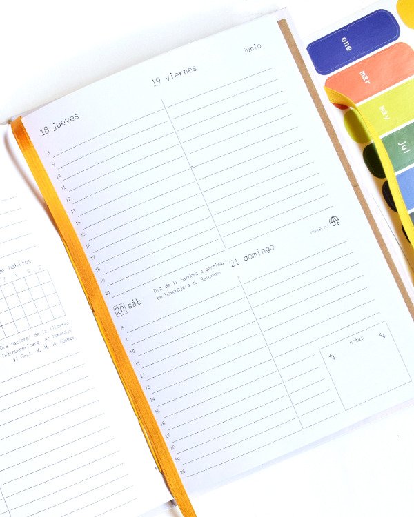 SEMANA A LA VISTA: se muestra la semana completa en dos páginas con feriados y fechas destacadas / con horario. 84 hojas total (168 pág)