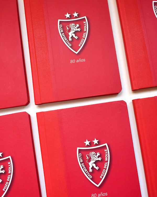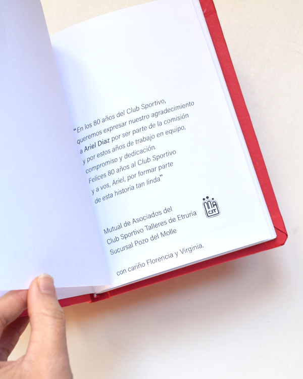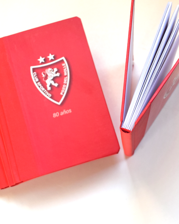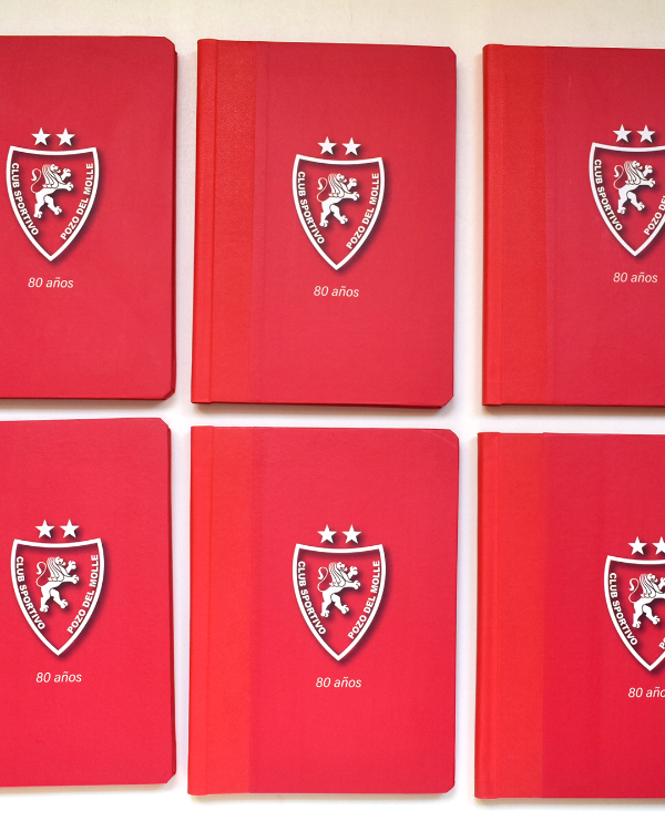 (estas fotografiás pertenecen a una tanda de 6 cuadernos A5 verticales para los 80 años de vida de un Club de Futbol, con el logo en la tapa, los colores del club y una dedicatoria en primer hoja)